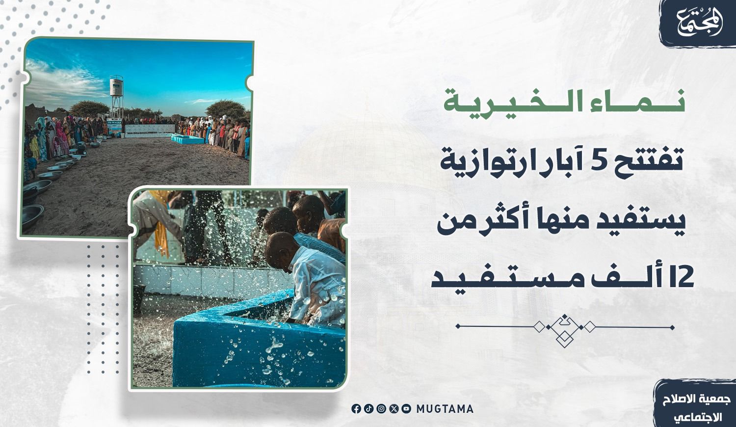 في إطار جهودها المستمرة للتخفيف من معاناة شعوب البلدان الأكثر حرمانًا، وضمن برامجها التنموية والإغاثية الميدانية، أعلنت نماء الخيرية بجمعية الإصلاح الاجتماعي عن إنجاز مشروع حيوي في جمهورية تشاد بحضور ميداني لرئيس قطاع التنمية والإغاثة خالد مبارك الشامري، يتمثل في حفر وافتتاح 5 آبار ارتوازية لتنقية المياه وتوفيرها للمجتمعات المحلية. وقد استفاد من هذه الآبار أكثر من 12,500 مستفيد من القرى المحيطة، في خطوة نوعية لتعزيز الأمن المائي وتحسين الظروف المعيشية في بيئات تعاني شحًّا كبيرًا في مصادر المياه الآمنة.