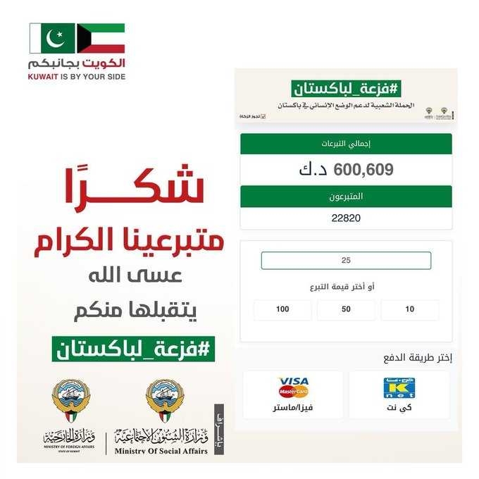 اختتام فزعة الكويت لباكستان بجمع 600 ألف دينار