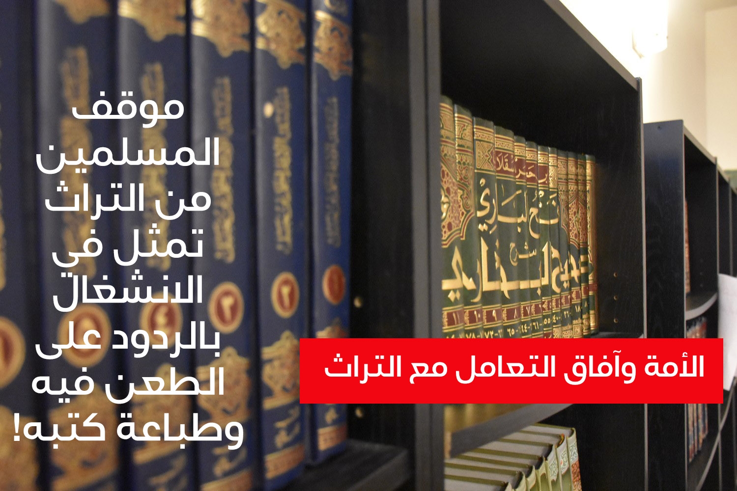 تمثل موقف المسلمين الأول ناحية التراث في مسارين؛ الأول: الانشغال بالردود على الطعن في التراث ومصادره لا سيما المرجعيات الأساسية (القرآن والسُّنة) التي أولاها المستشرقون أهمية كبيرة في الطعن والتفكيك، ولعل أول هذه الردود كانت عند محمد عبده (1849 – 1905م) في الرد على حالتي أرنست رينان (1832 - 1892)(1)، وجابرييل هانوتو (1853 – 1944م)(2)، ثم مصطفى الغلاييني (1886 – 1944م) في الرد على طعون اللورد «كرومر» (1841 – 1917م)(3).