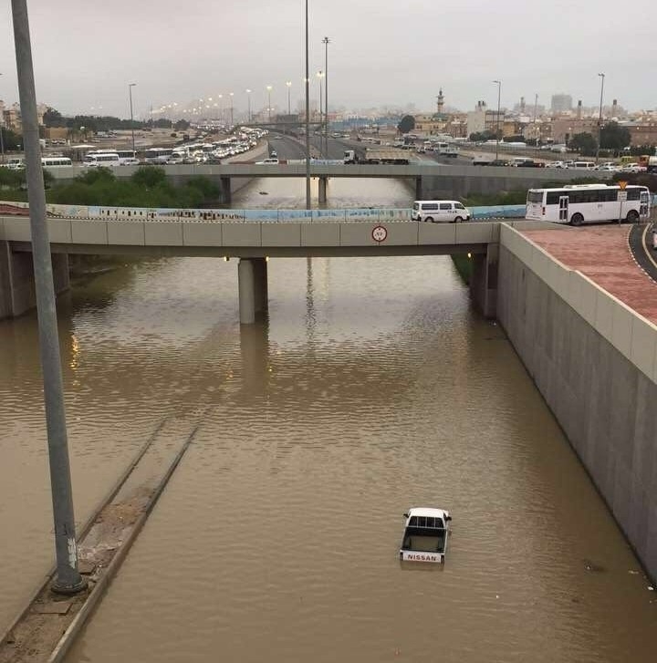 وتعرض جسر دوار المنقف الجديد للغرق بسبب الأمطار، وقام عدد من المواطنين بإنقاذ بعض العالقين في المياه.