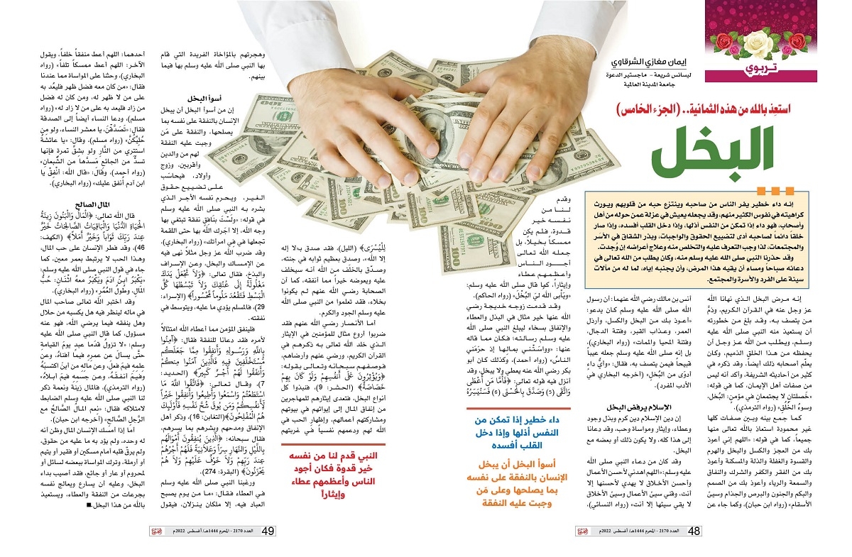 إنه مرض البخل الذي نهانا الله عز وجل عنه في القرآن الكريم، وذمَّ من يتصف به، وقد بلغ من خطورته أن يستعيذ منه النبي صلى الله عليه وسلم، ويطلب من الله عز وجل أن يحفظه من هذا الخلق الذميم، وكان يعلّم أصحابه ذلك أيضاً، وقد ذكره في كثير من أحاديثه الشريفة، وأكد أنه ليس من صفات أهل الإيمان، كما في قوله: «خَصلتانِ لا يجتمعانِ في مؤمنٍ: البُخل، وسوءُ الخُلُقِ» (رواه الترمذي).