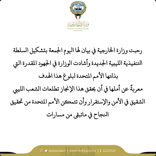 الكويت ترحب بتشكيل السلطة التنفيذية الليبية الجديدة