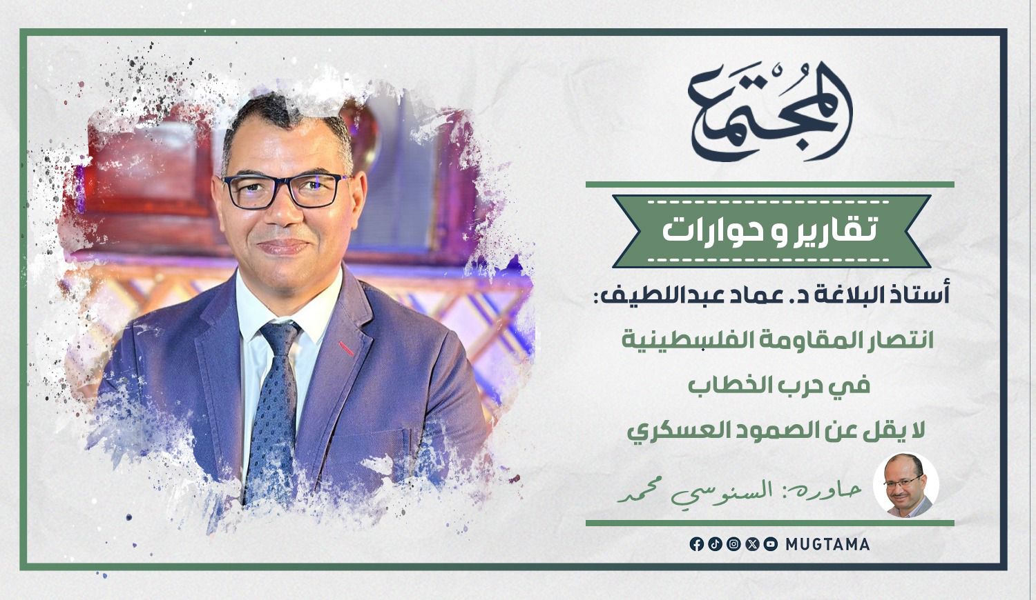 في هذا الحوار مع د. عماد عبداللطيف، نتعرض لقضايا كثيرة تتصل بخطاب المقاومة وقدرته على التصدي لخطاب الاحتلال الصهيوني، وعلى تقديم خطاب إنساني يجتذب شرائح واسعة داعمة للقضية الفلسطينية العادلة ومقاومتها الباسلة.