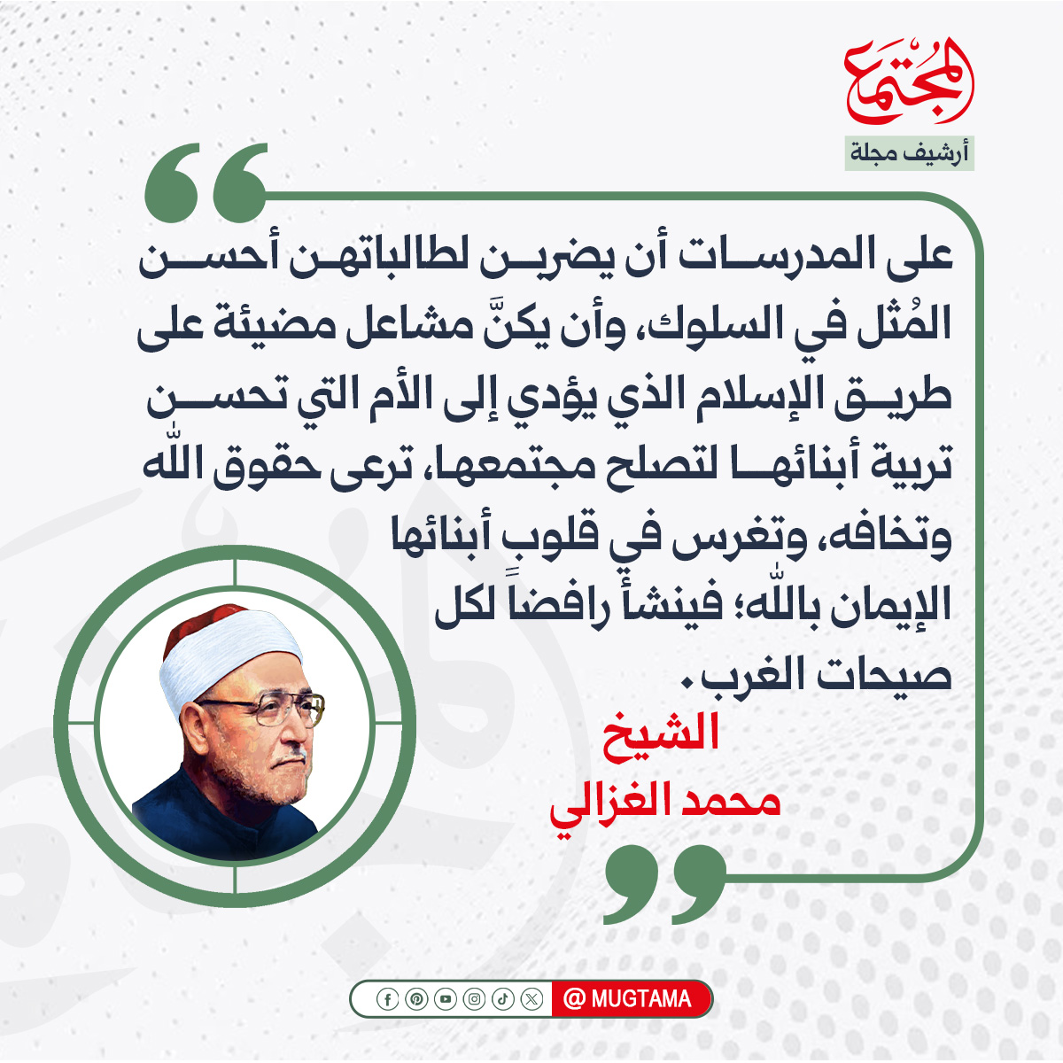 على المدرسات أن يضربن لطالباتهن أحسن المُثل في السلوك، وأن يكنَّ مشاعل مضيئة على طريق الإسلام الذي يؤدي إلى الأم التي تحسن تربية أبنائها لتصلح مجتمعها، ترعى حقوق الله وتخافه، وتغرس في قلوب أبنائها الإيمان بالله؛ فينشأ رافضاً لكل صيحات الغرب.