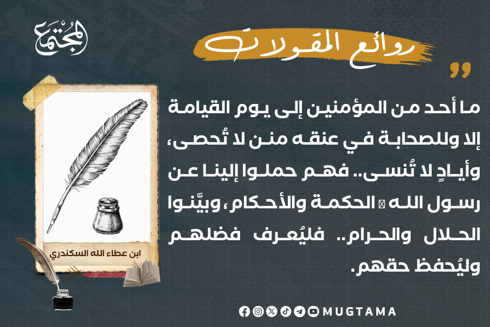 ما أحد من المؤمنين إلى يوم القيامة إلا وللصحابة في عنقه منن لا تُحصى، وأيادٍ لا تُنسى.. فهم حملوا إلينا عن رسول الله ﷺ الحكمة والأحكام، وبيَّنوا الحلال والحرام.. فليُعرف فضلهم وليُحفظ حقهم.