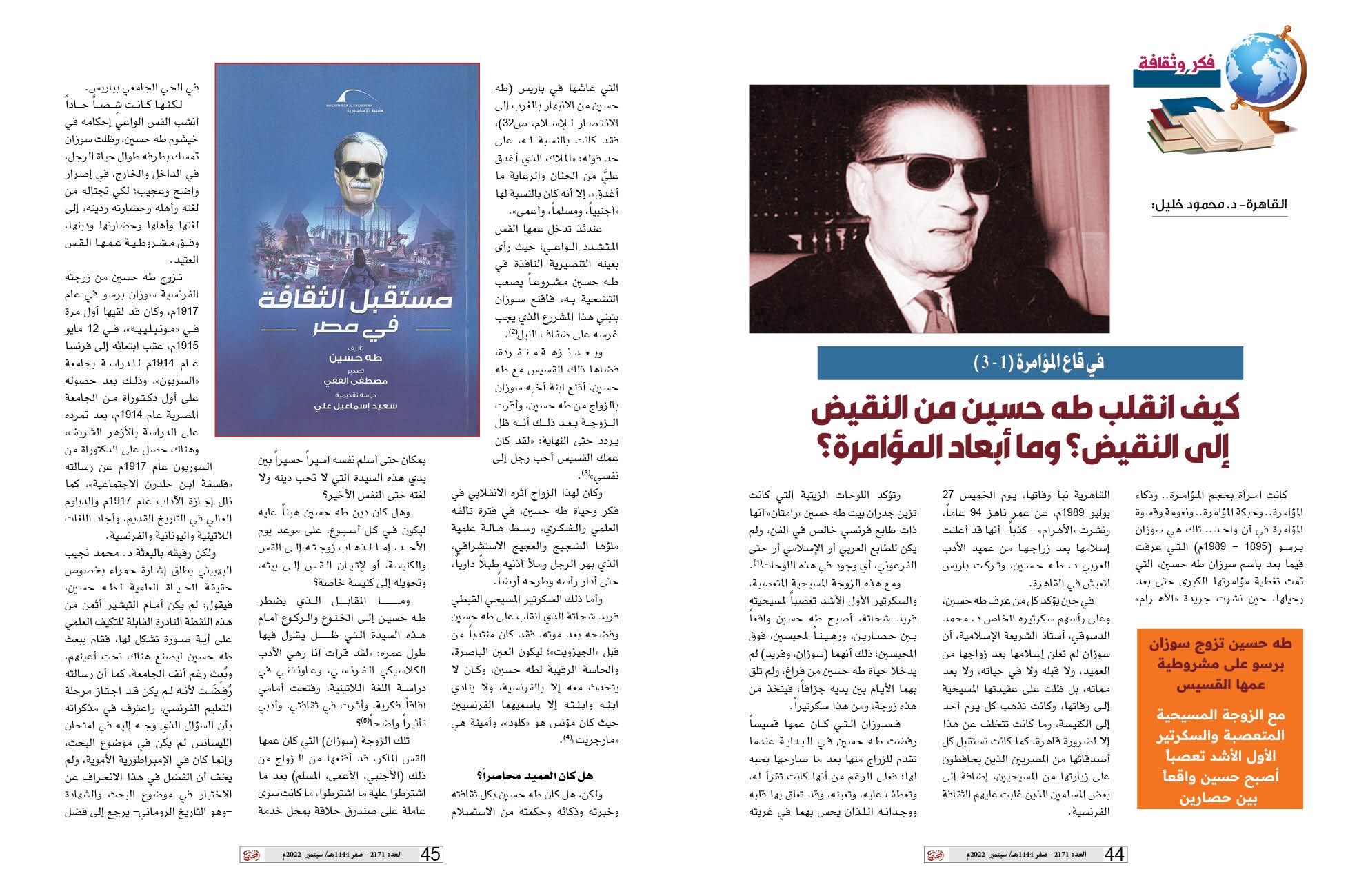 (2) طه حسين من الانبهار بالغرب إلى الانتصار للإسلام، د. محمد عمارة، هدية مجلة الأزهر، القاهرة، ذو القعدة 1435هـ/ سبتمبر 2014م.