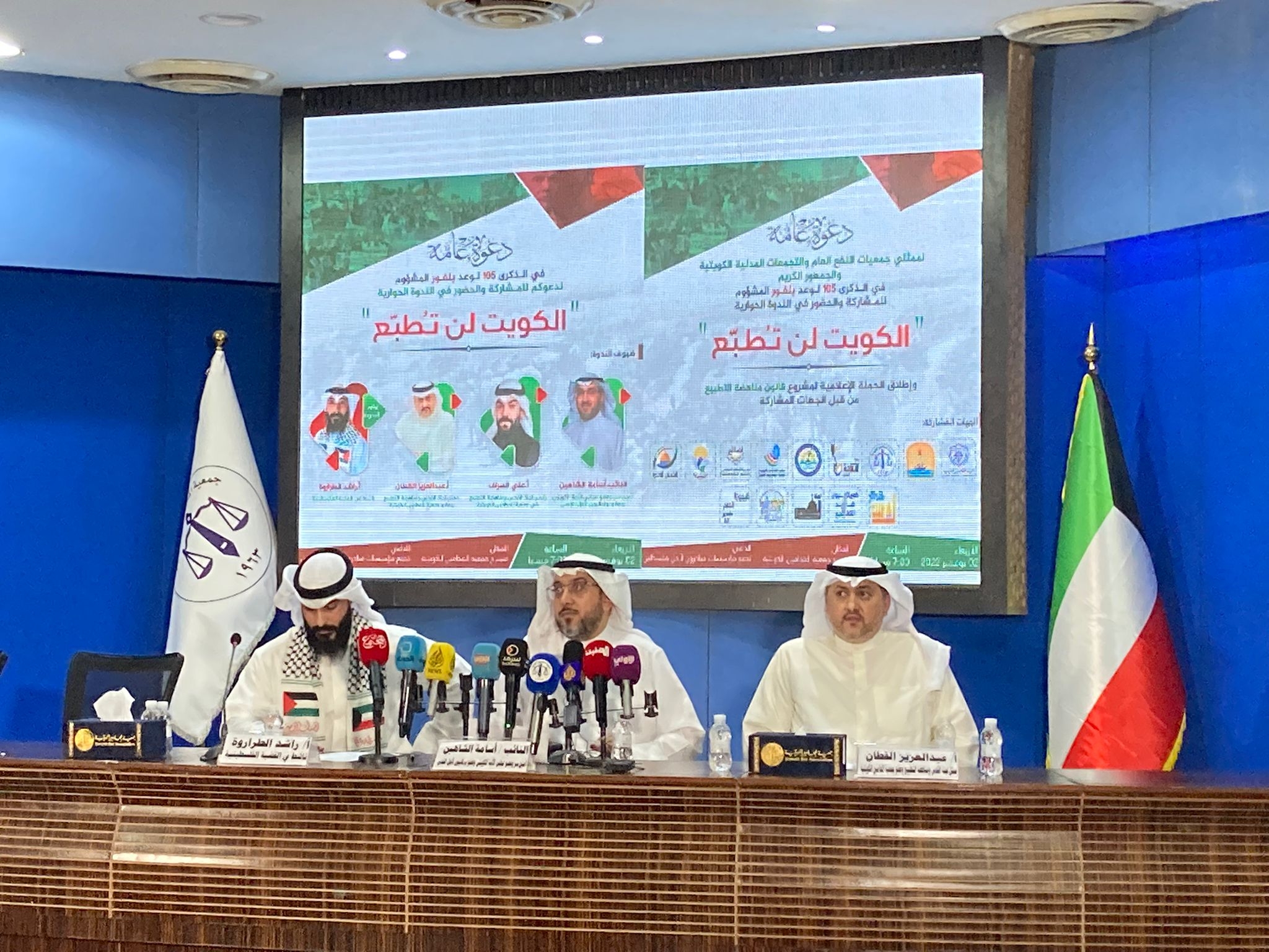 نظمت مؤسسات المجتمع المدني الكويتية، مساء أمس الأربعاء، ندوة حوارية في جمعية المحامين بمناسبة مرور 105 أعوام على "وعد بلفور" بعنوان "الكويت لن تطبع"، أطلقت من خلالها، حملة إعلامية لمشروع قانون مناهض للتطبيع.