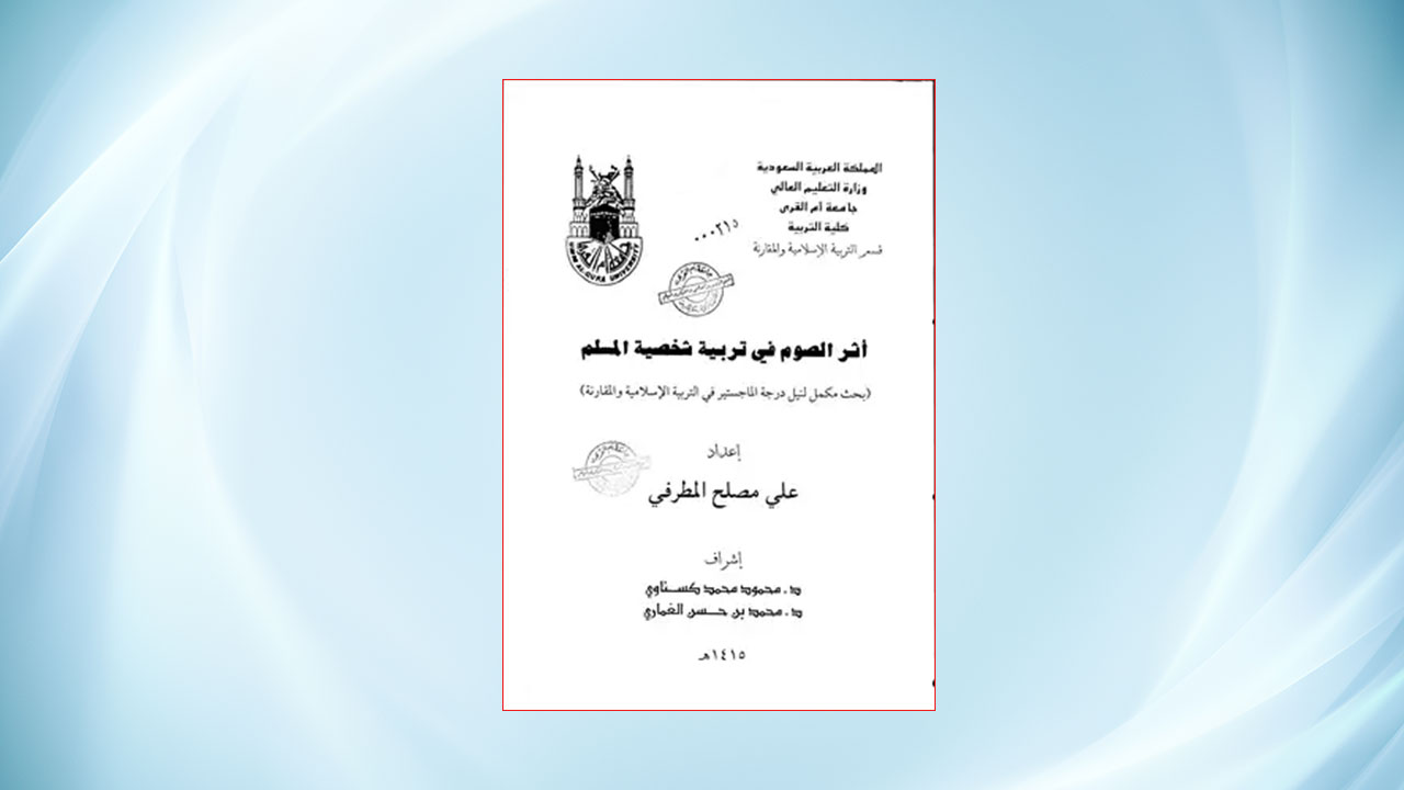 «أثر الصوم في تربية شخصية المسلم»، رسالة ماجستير للباحث السعودي علي مصلح المطرفي، طُبعت في كتاب يستعرض أثر العبادات في الإسلام في تهذيب النُّفوس واستقامة السلوك، وتطهير النفس وتزكيتها من الأدران، وإصلاحها وتجديد العودة والإقبال على الله تعالى.