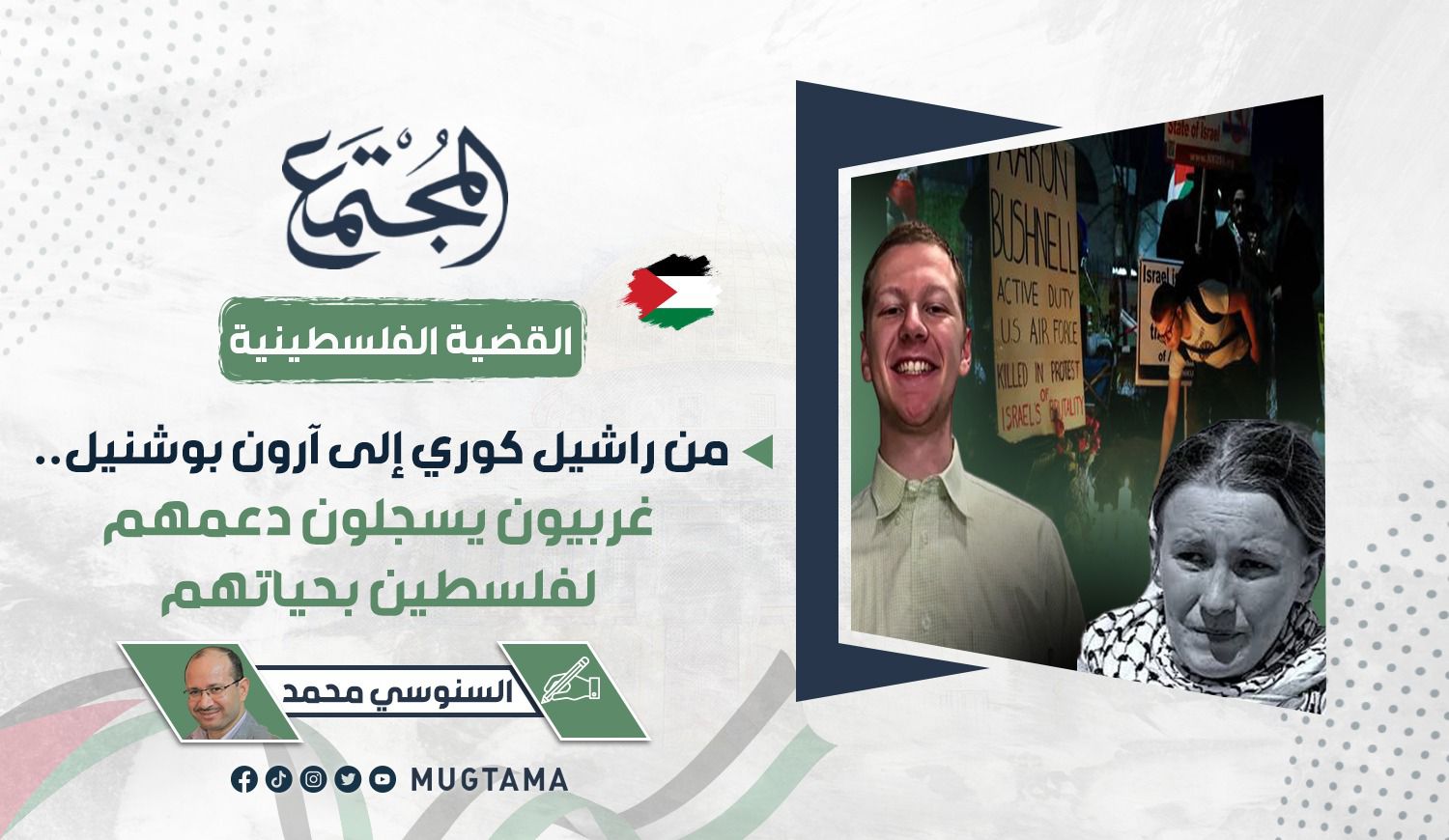 وفي ذات الصفحة من كتاب التضامن، يطالعنا آرون بوشنيل، طيار أمريكي، وهو من مواليد عام 1999م، وأحد أفراد القوات الجوية الأمريكية، وقد ظهر مرتديًا زيه العسكري وحرص على أن يشاركنا دقائق حياته الأخيرة ببث مباشر أعلن فيه رأيه إزاء ما يجري في غزة، قبل أن يتخذ قرارًا وصفه هو نفسه بأنه «عمل احتجاجي شديد، لكن مقارنة بما شهده الناس في فلسطين على أيدي مستعمريها؛ فإن الأمر ليس متطرفًا على الإطلاق، وهذا ما قررت الطبقة الحاكمة لدينا أنه أمر طبيعي»، ثم أشعل النار في نفسه أمام السفارة «الإسرائيلية» بواشنطن، احتجاجًا على العدوان الهمجي بغزة.