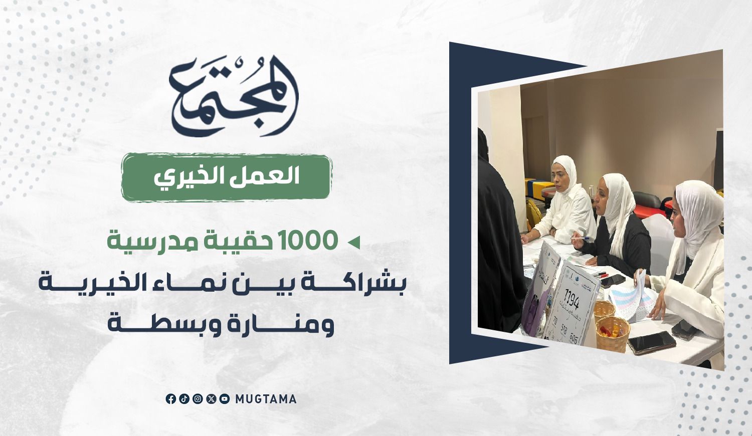 وزعت نماء الخيرية بجمعية الإصلاح الاجتماعي بشراكة إستراتيجية مع فريقي منارة وبسطة التطوعي حقائب مدرسية على الأيتام والأطفال من أبناء الأسر المتعففة، وذلك يومي الجمعة والسبت في مقر مركز التطوع لنماء الخيرية في منطقة الروضة، وقد استفاد من المشروع أكثر من 1000 طالب وطالبة.