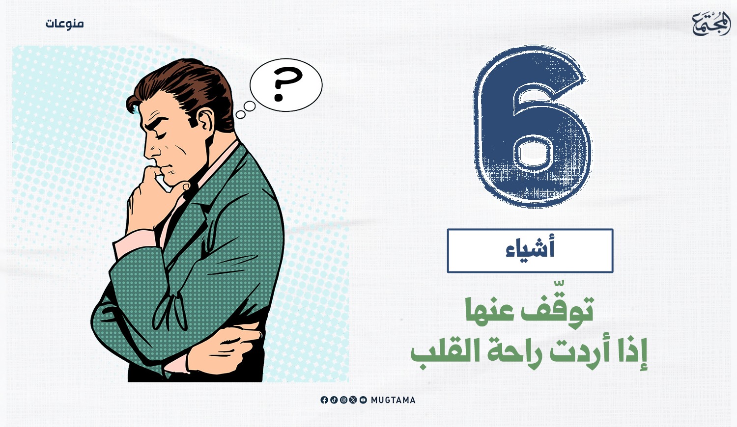 من هنا يتبين أن راحة القلب لا تأتي دفعة واحدة، بل تُبنى بقرارات واعية، فحين تتوقف عن هذه الأشياء الستة، ستكتشف أن الطمأنينة لم تكن بعيدة، بل كانت تنتظر منك أن تُخفف الحمل عن قلبك.