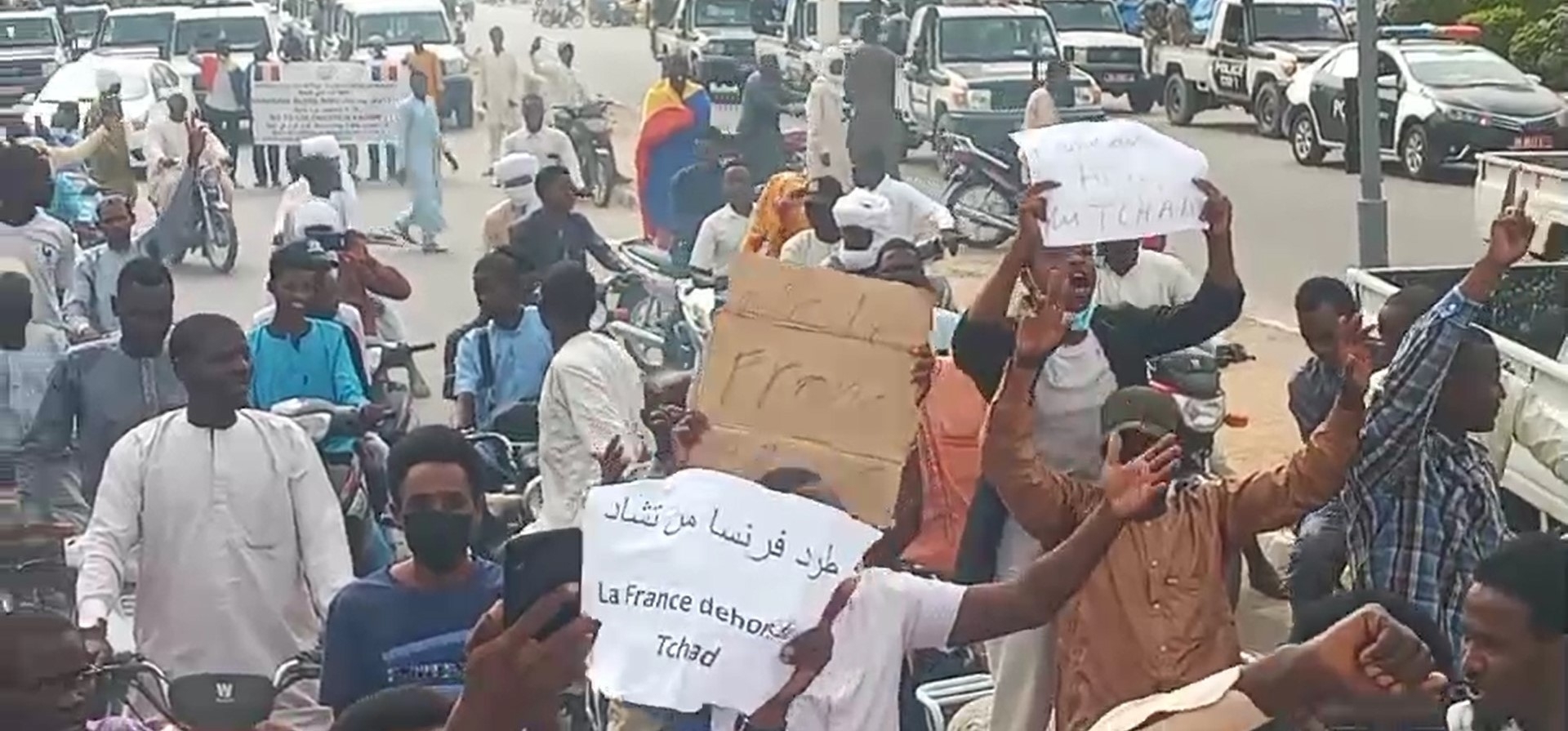 ورفع المتظاهرون لافتات كتب عليها "تشاد حرة.. فرنسا برا".