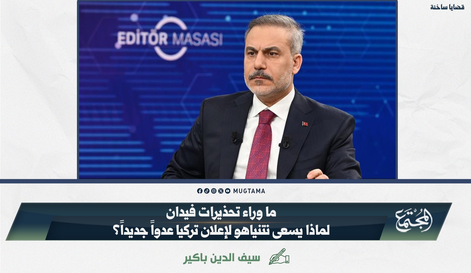 المشهد، تبرز تصريحات وزير الخارجية التركي هاكان فيدان محذرًا من توجهات «إسرائيلية»
